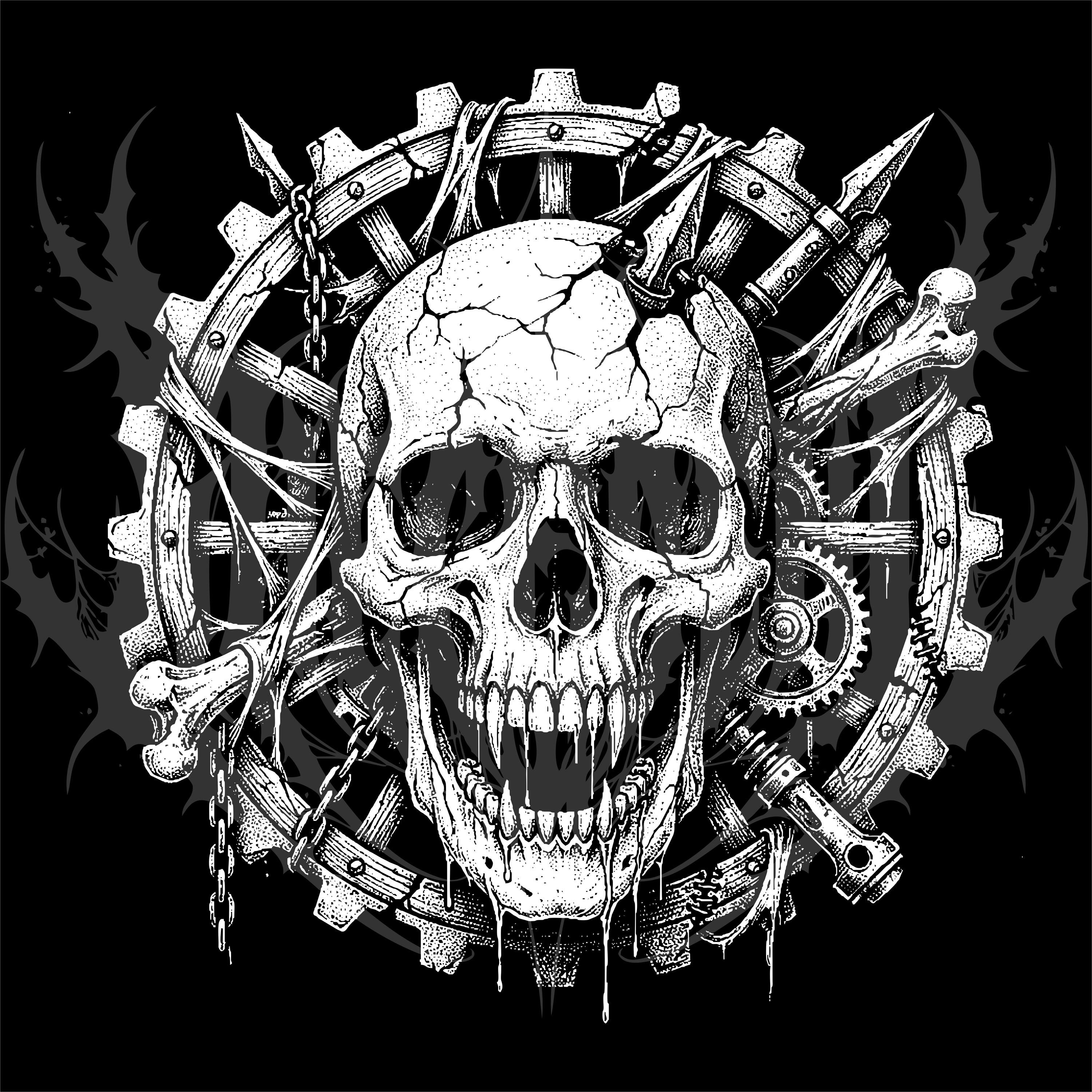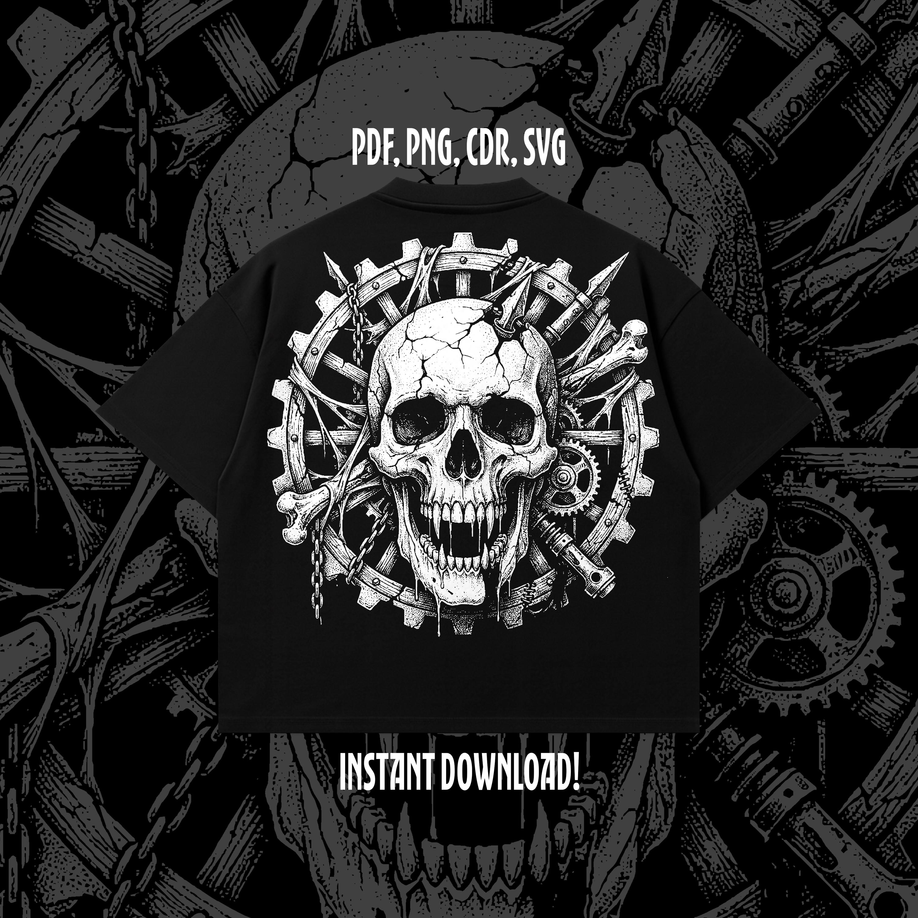 Design B&W Back Tee Dark Mechanical Skull Abomination Horror Skeleton Gothic Grunge Vector Art