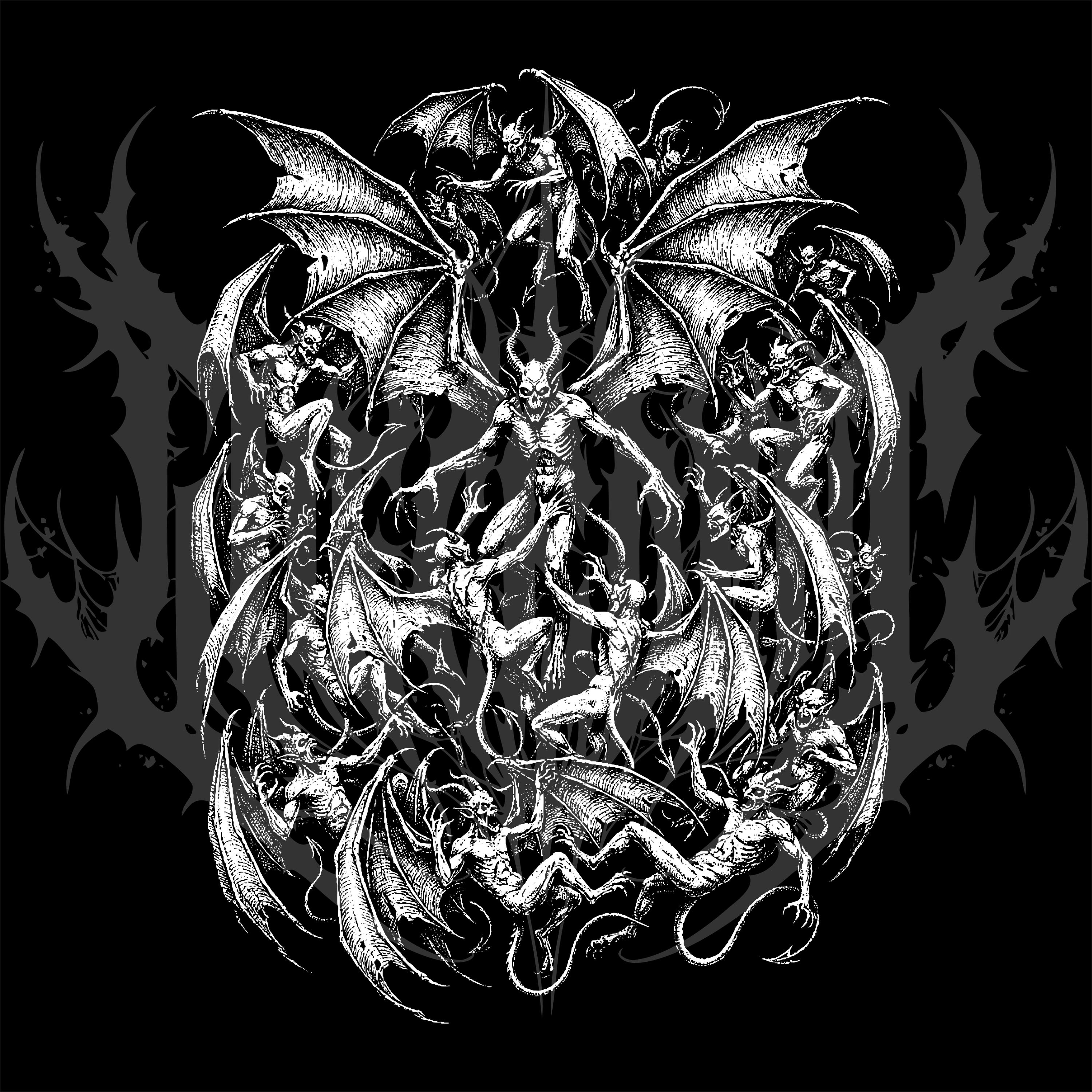 Design B&W Back Tee Dark Legion Winged Demons Horror Skeleton Gothic Grunge Vector Art