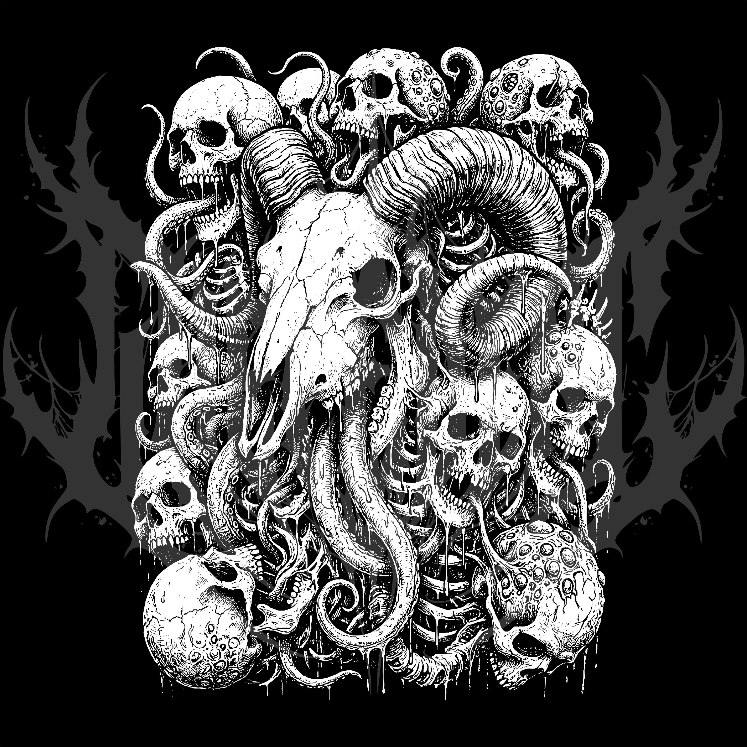 Design B&W Back Tee Dark Horned Skull Cluster Horror Skeleton Gothic Grunge Vector Art