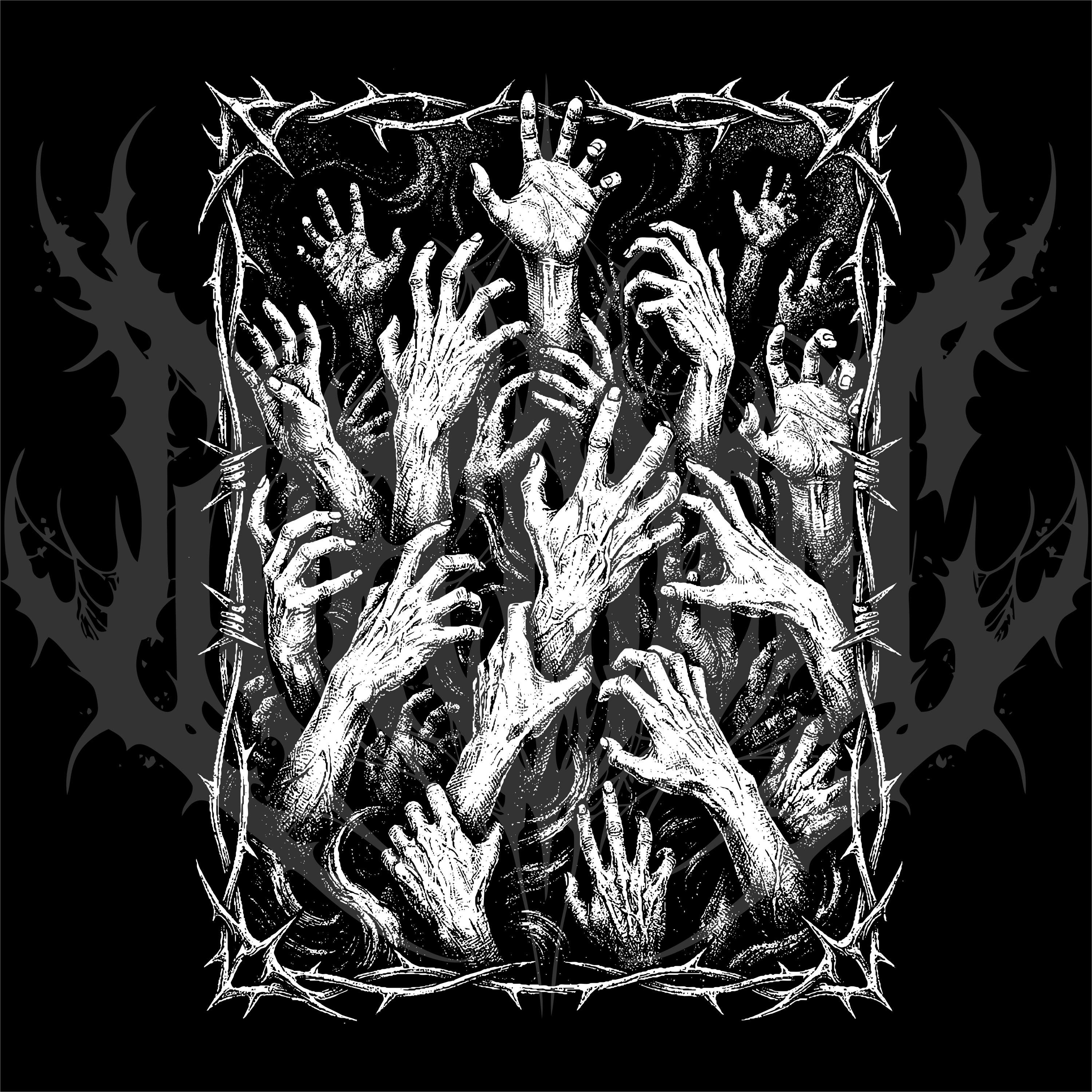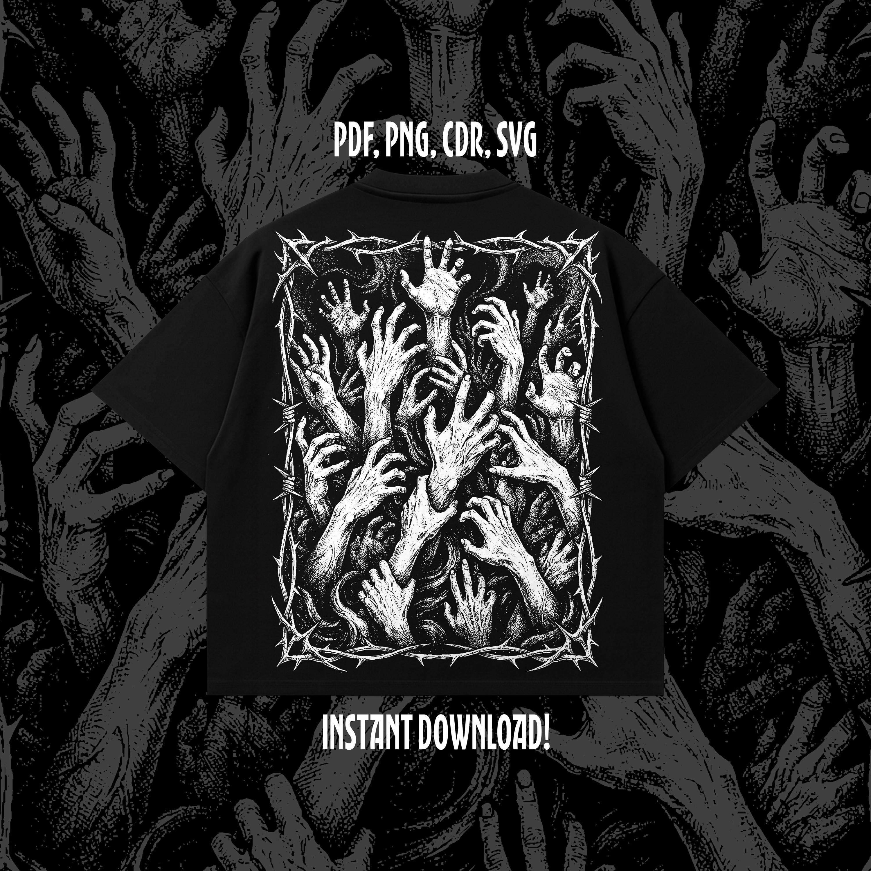 Design B&W Back Tee Dark Hands of the Damned Horror Skeleton Gothic Grunge Vector Art