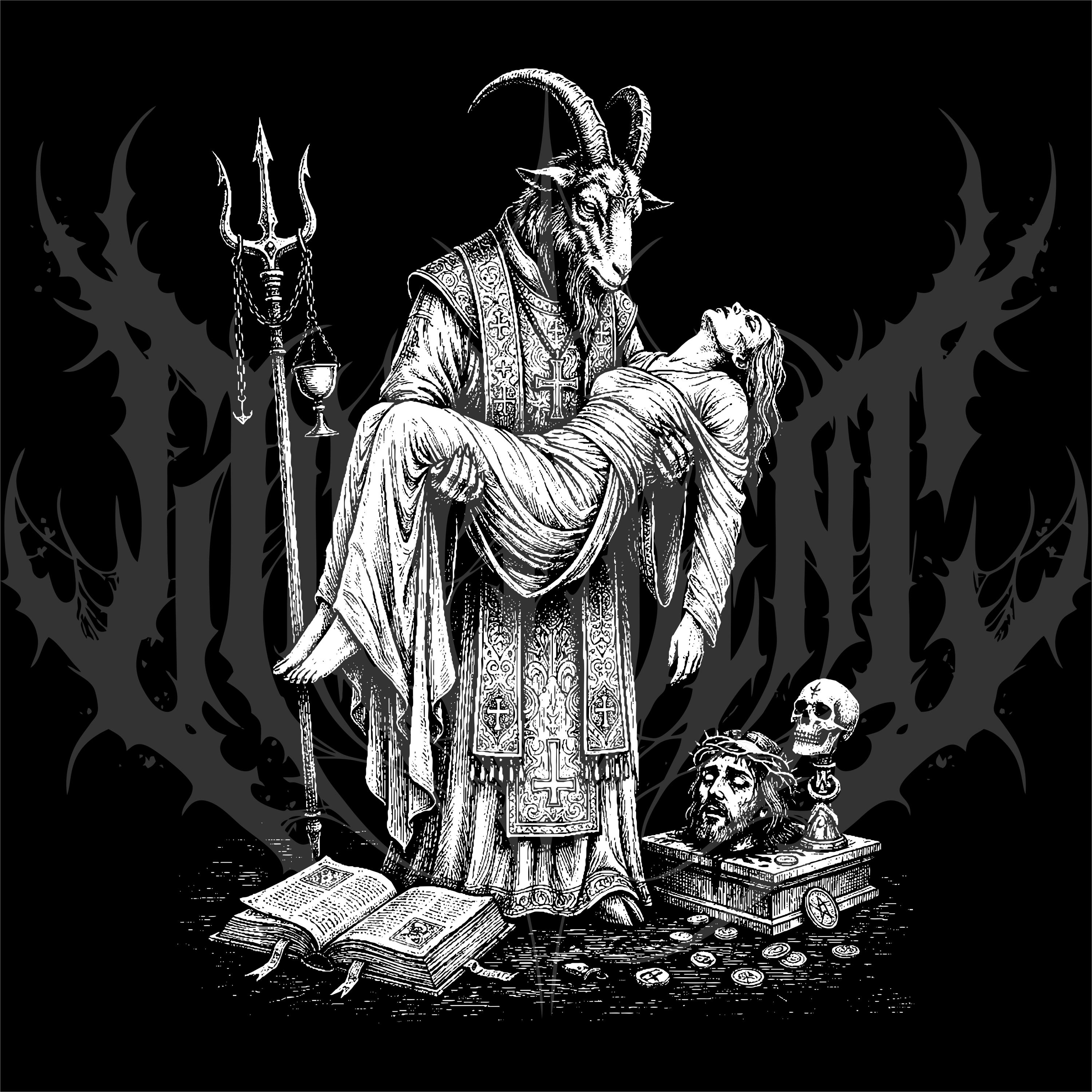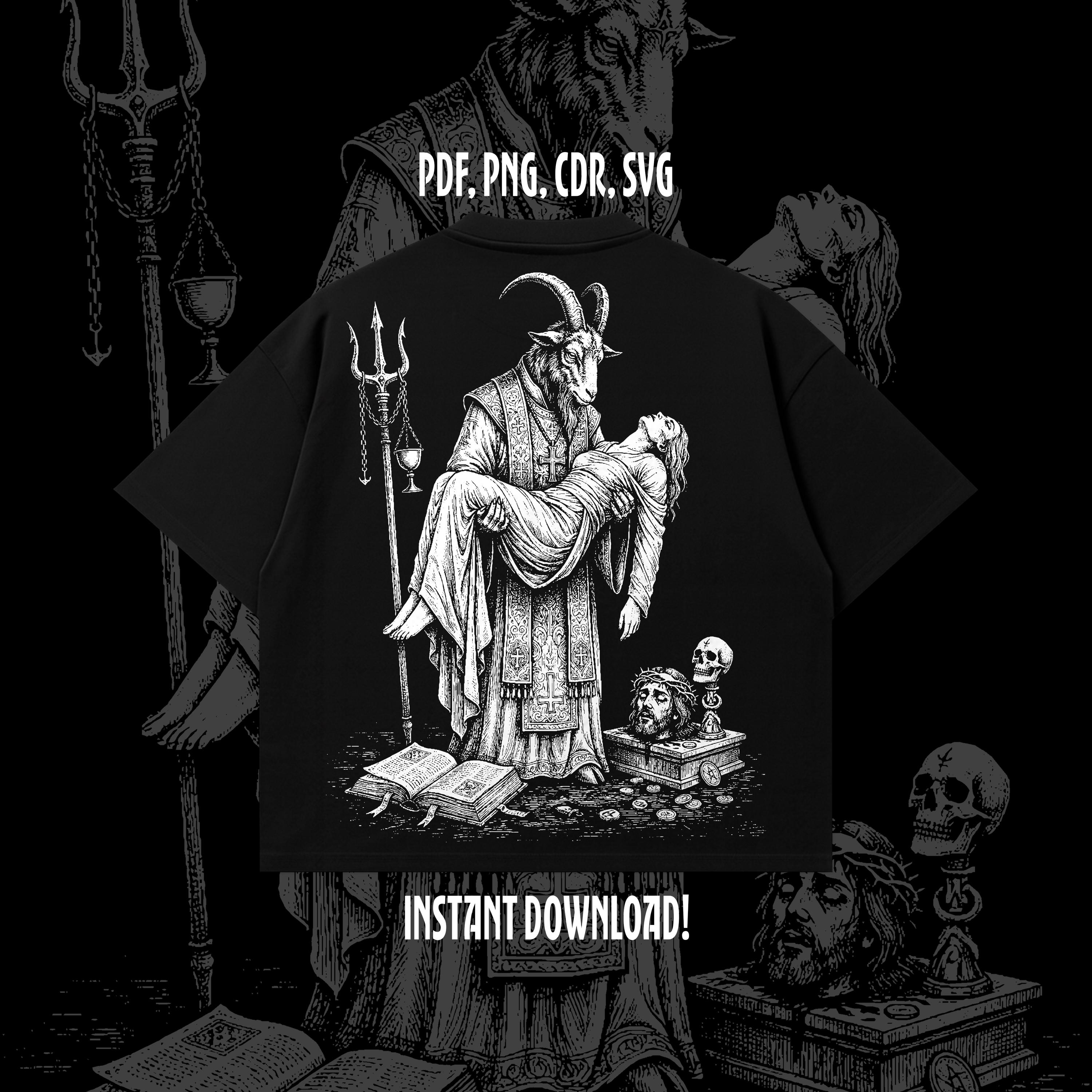 Design B&W Back Tee Dark Goat Headed Priest Horror Skeleton Gothic Grunge Vector Art