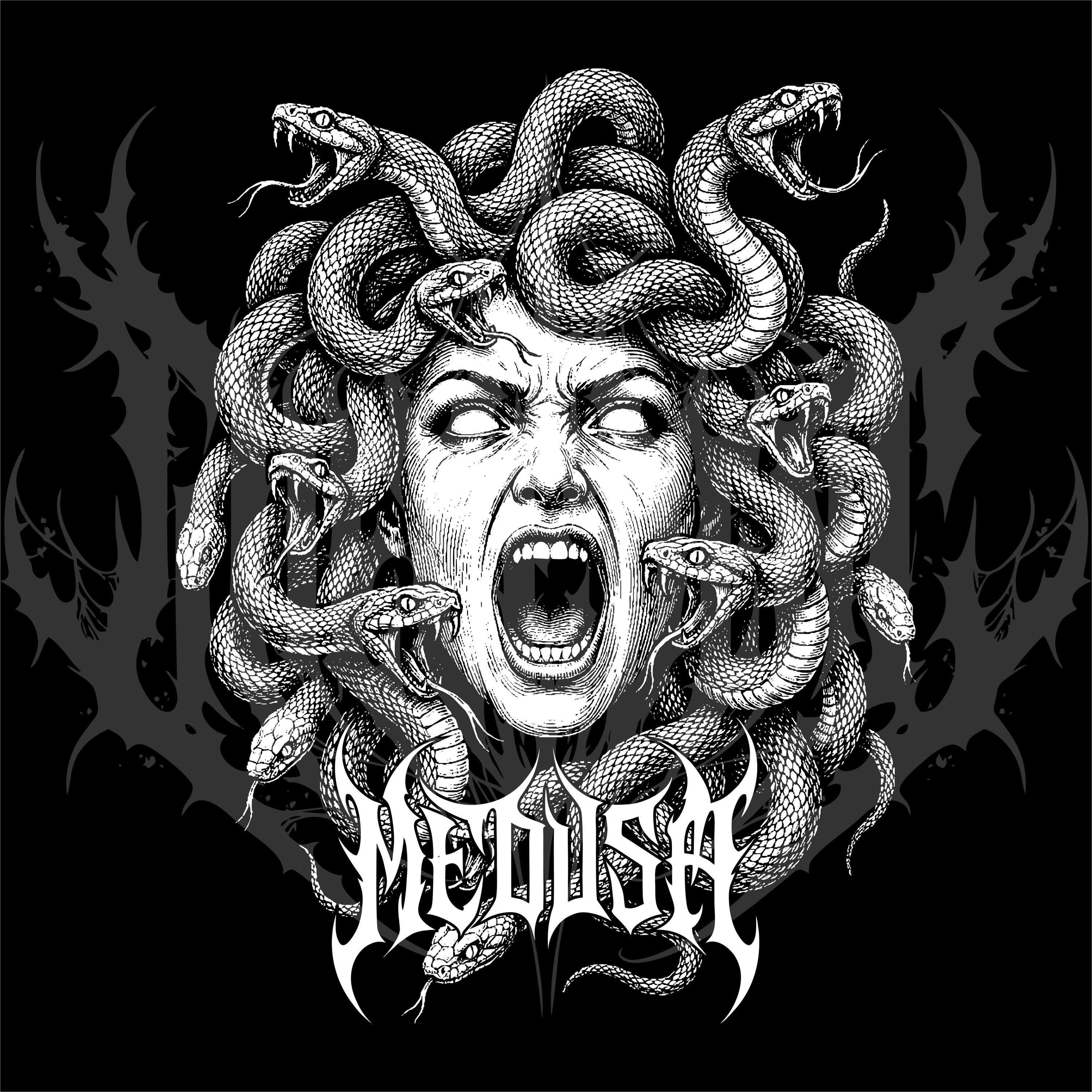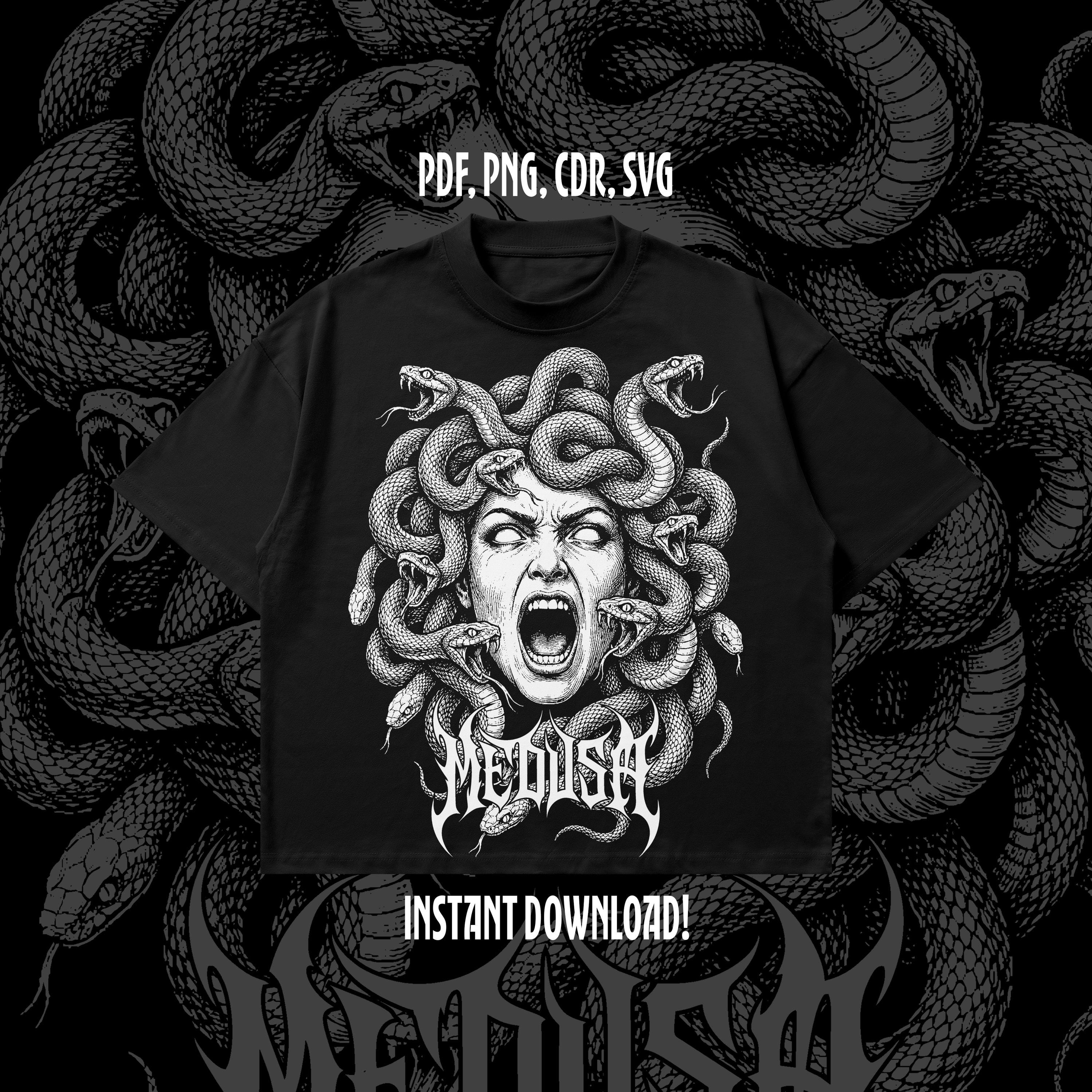 Design B&W Front Tee Dark Screaming Medusa Snake Horror Skeleton Gothic Grunge Vector Art
