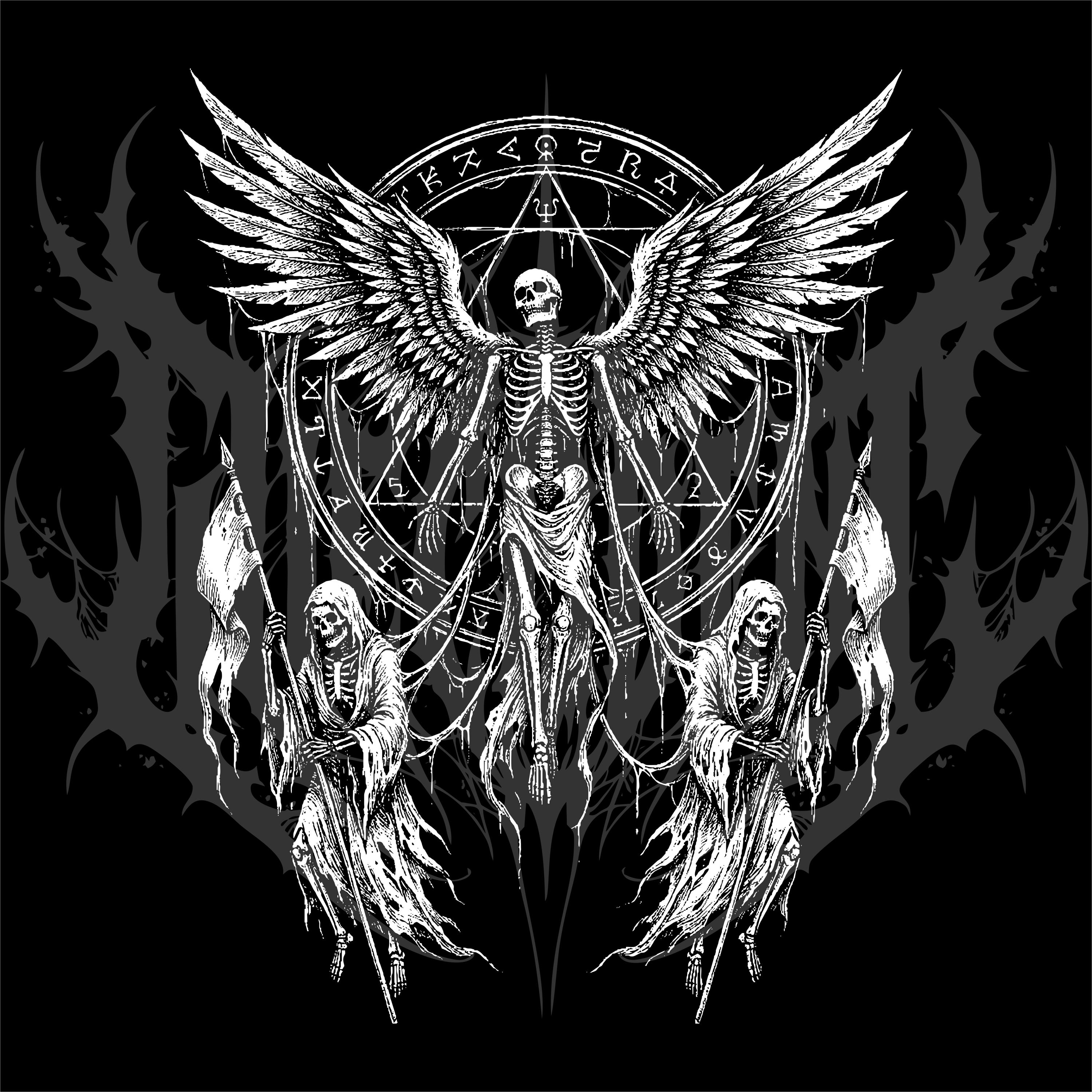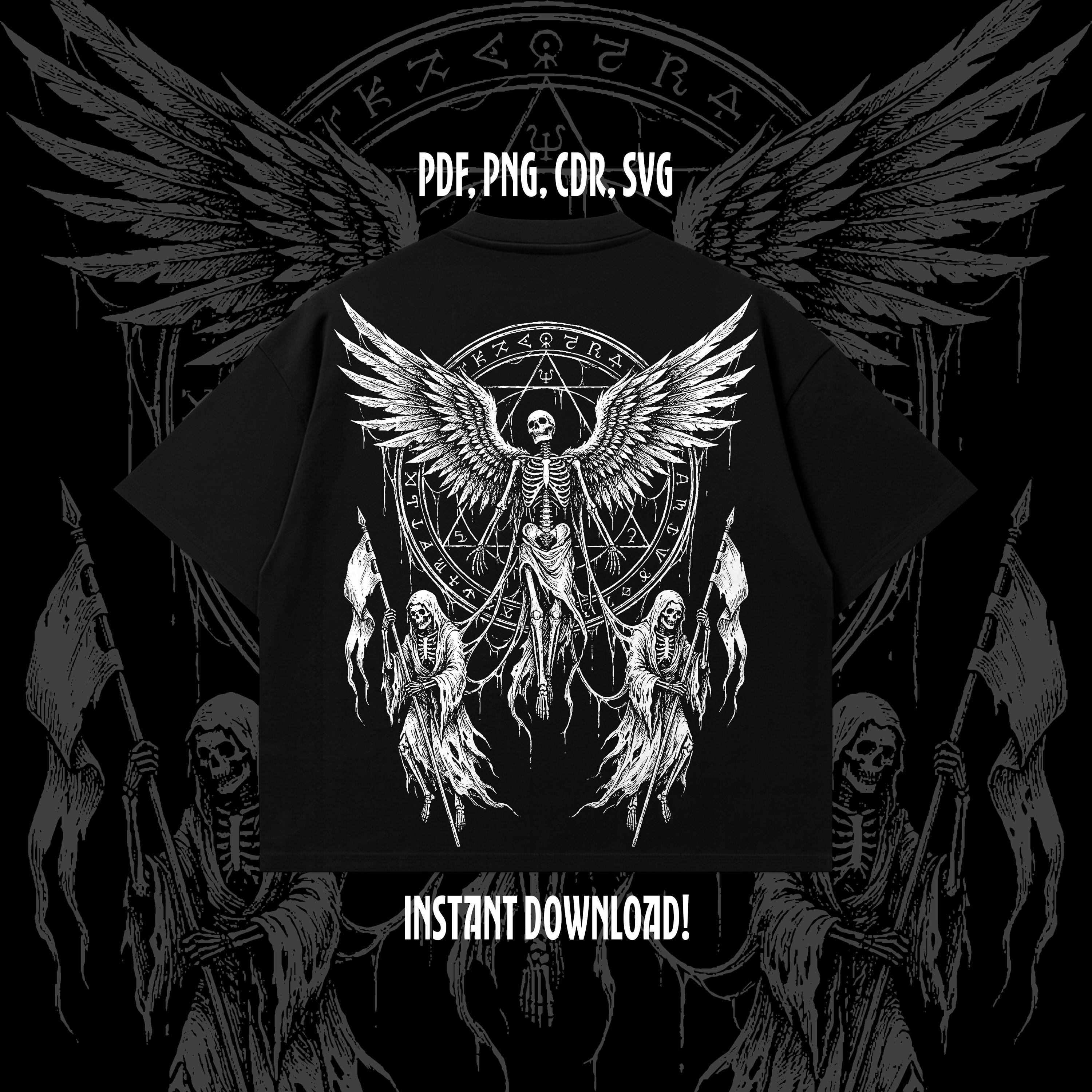 Design B&W Back Tee Dark Winged Harbinger Circle Horror Skeleton Gothic Grunge Vector Art