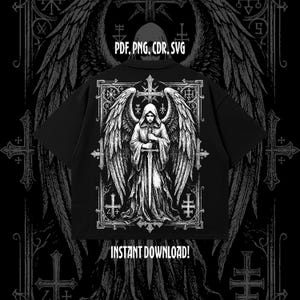 Each file includes Clean isolated artwork Pure white illustration on solid black background Winged skeletal angel centerpiece Occult ritual circle with symbols Symmetrical ritual guardians Scalable for print and digital use