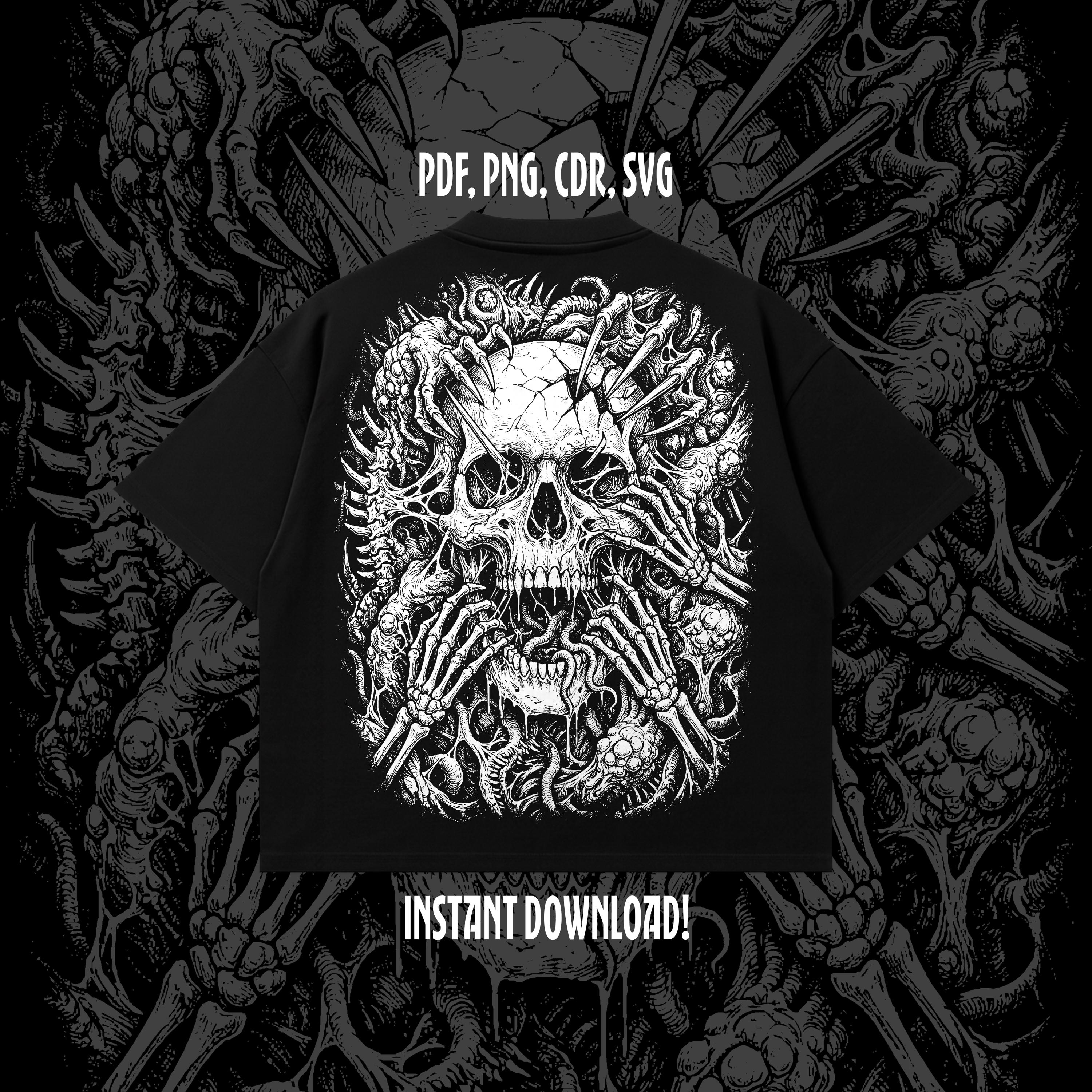 Hyper detailed gothic horror engraving illustration Strong black and white high contrast aesthetic Vector formats such as PDF SVG CDR or PNG depending on the listing Exceptional clarity even at very large sizes 8K style sharp appearance for professional results Optimized for apparel printing merchandise tattoo projects and dark fantasy artwork