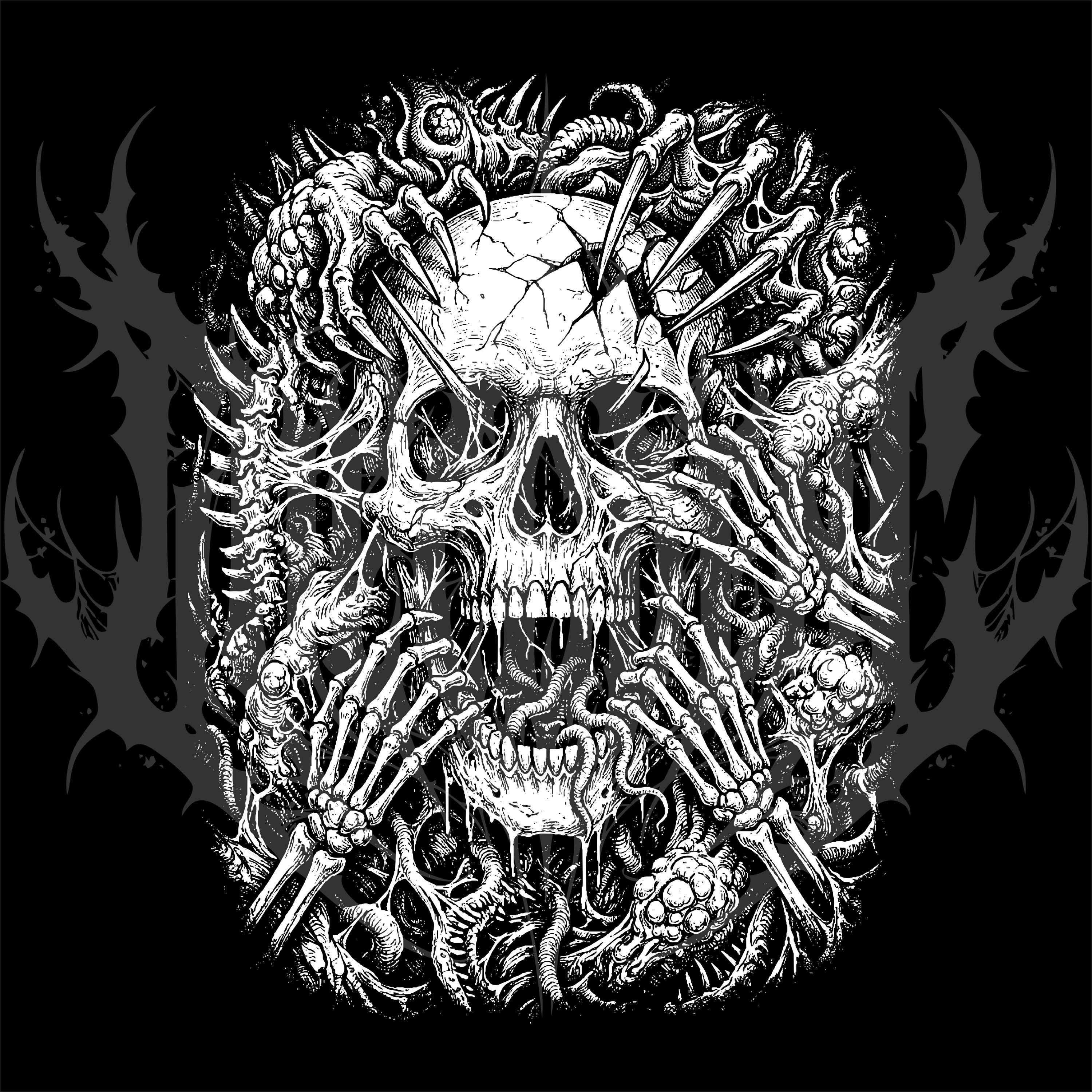 This artwork features a mutated skull fused with organic textures, skeletal structures, and grotesque details, rendered in a dramatic high contrast engraving style. The composition delivers intense atmosphere and visual impact inspired by gothic horror, dark fantasy, metal culture, tattoo art, and alternative aesthetics.