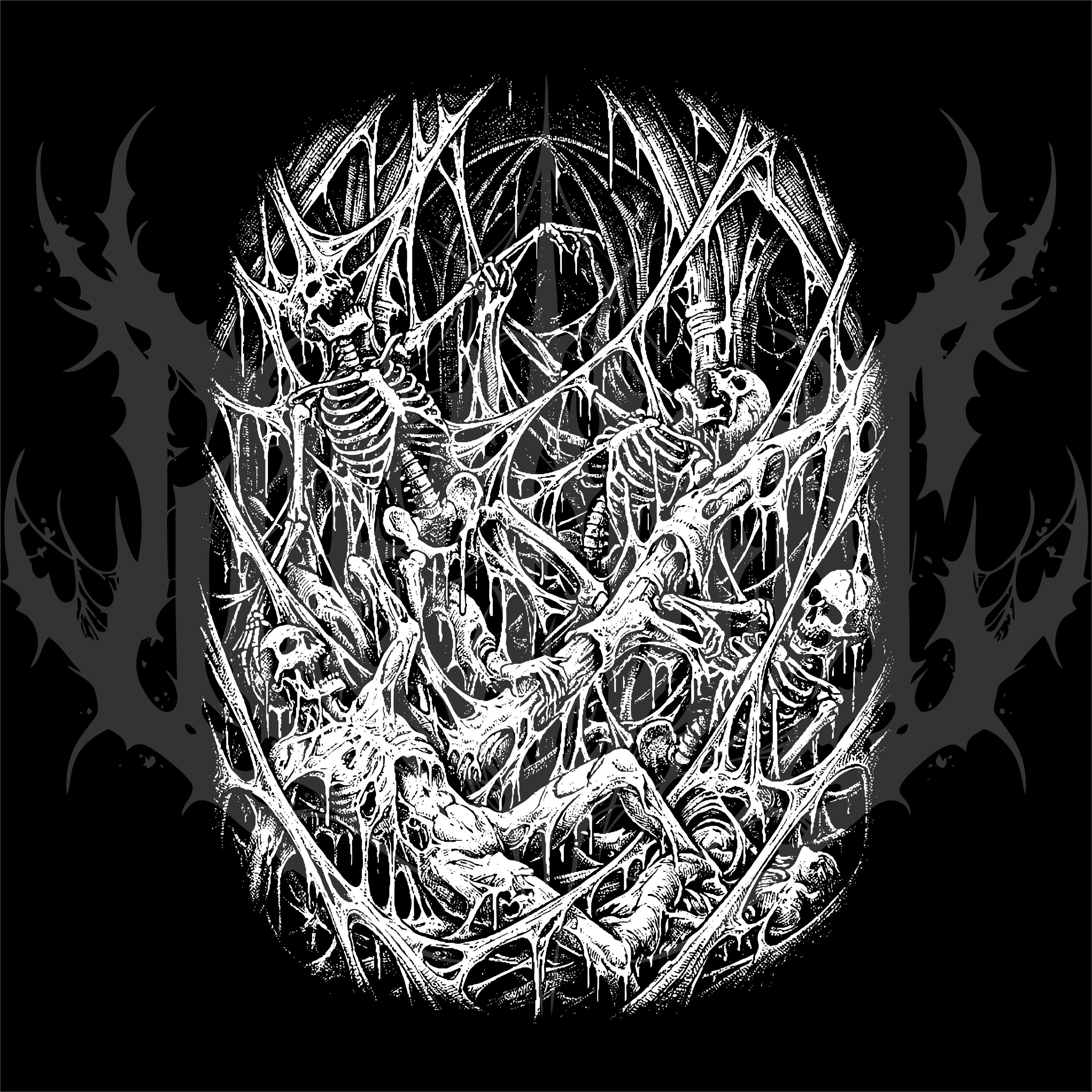 This artwork features entangled skeleton figures trapped within organic web like structures, rendered in a dramatic high contrast engraving style. The composition evokes a haunting atmosphere inspired by gothic horror dark fantasy metal culture tattoo art and alternative aesthetics.