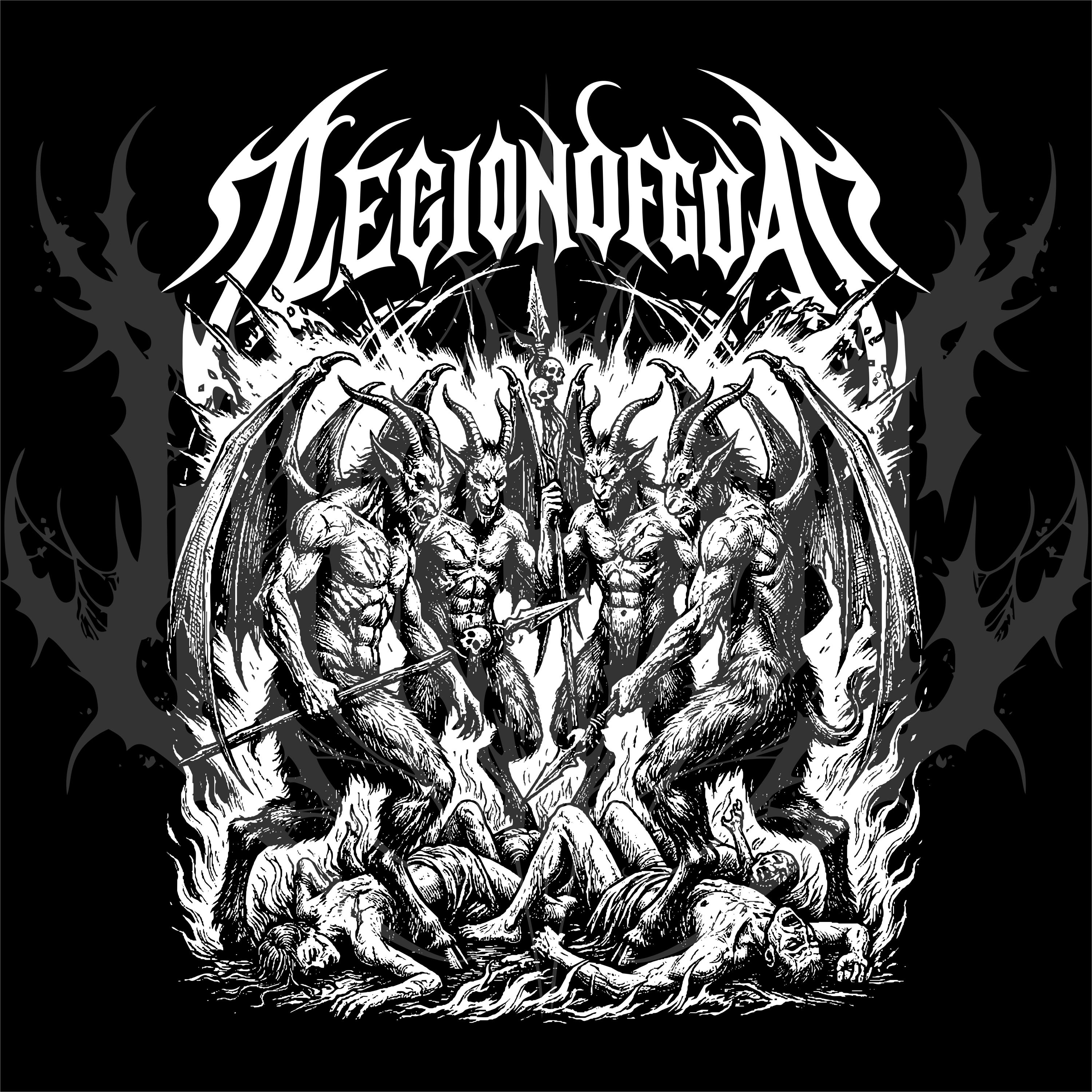 This artwork depicts a legion of horned demonic figures standing over fallen bodies, rendered in a dramatic high contrast engraving style. The composition conveys raw power chaos and dark ritual atmosphere inspired by gothic horror dark fantasy metal culture tattoo art and alternative aesthetics.