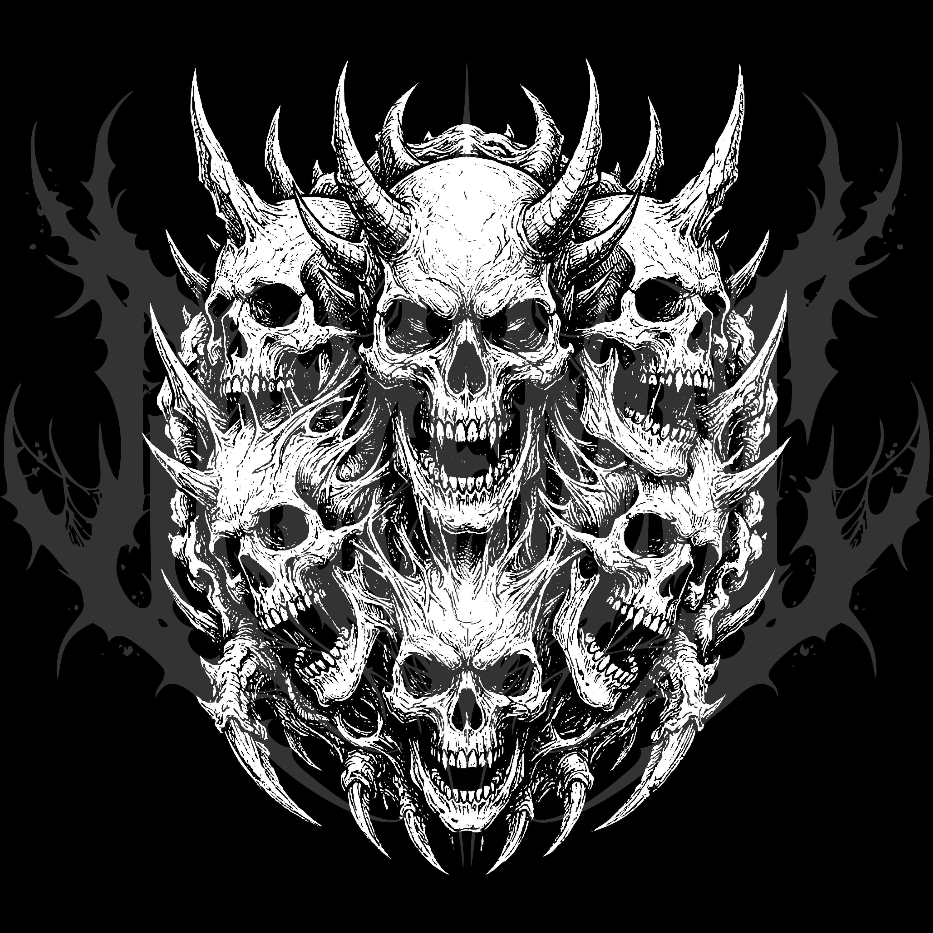 This artwork features multiple grotesque demonic skulls fused into a symmetrical composition, complete with horns sharp teeth and organic textures. Rendered in a dramatic high contrast engraving style the illustration conveys power darkness and ritualistic intensity inspired by gothic horror dark fantasy metal culture tattoo art and alternative aesthetics.