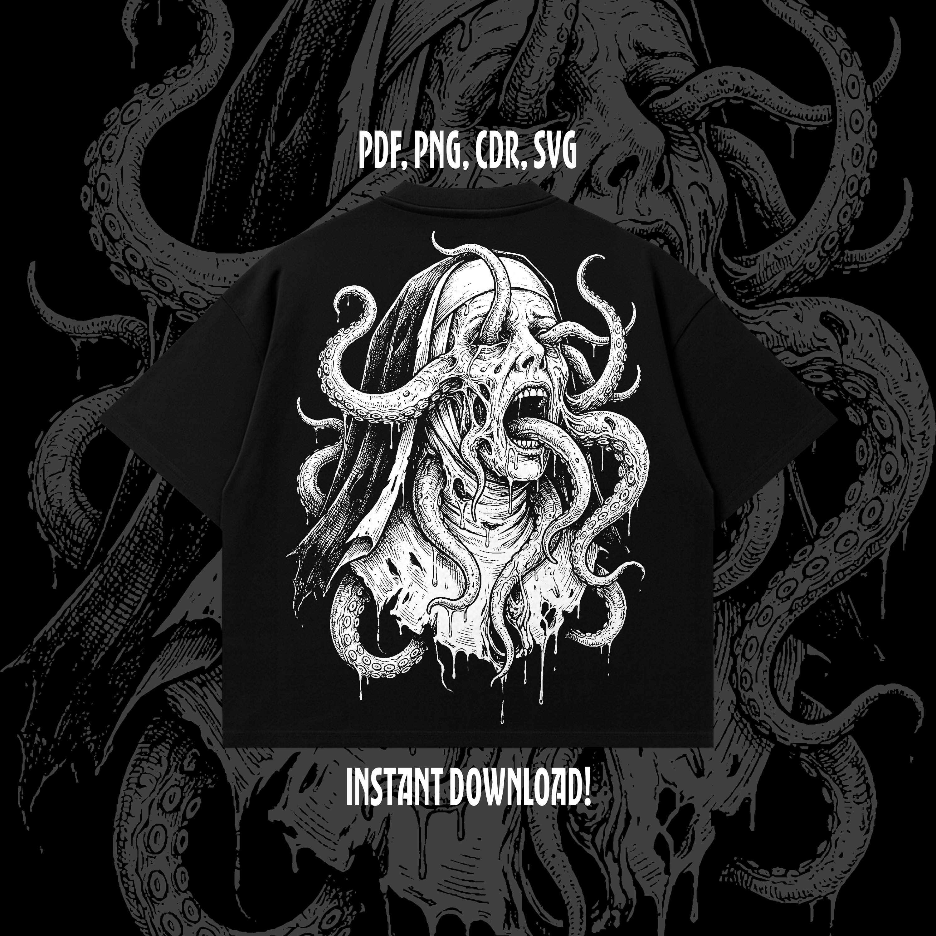 Elevate your creative projects with this Lovecraftian Nun Engraving Illustration, a hyper detailed dark artwork created for artists designers and collectors who appreciate cosmic horror blasphemous symbolism and extreme gothic religious aesthetics.