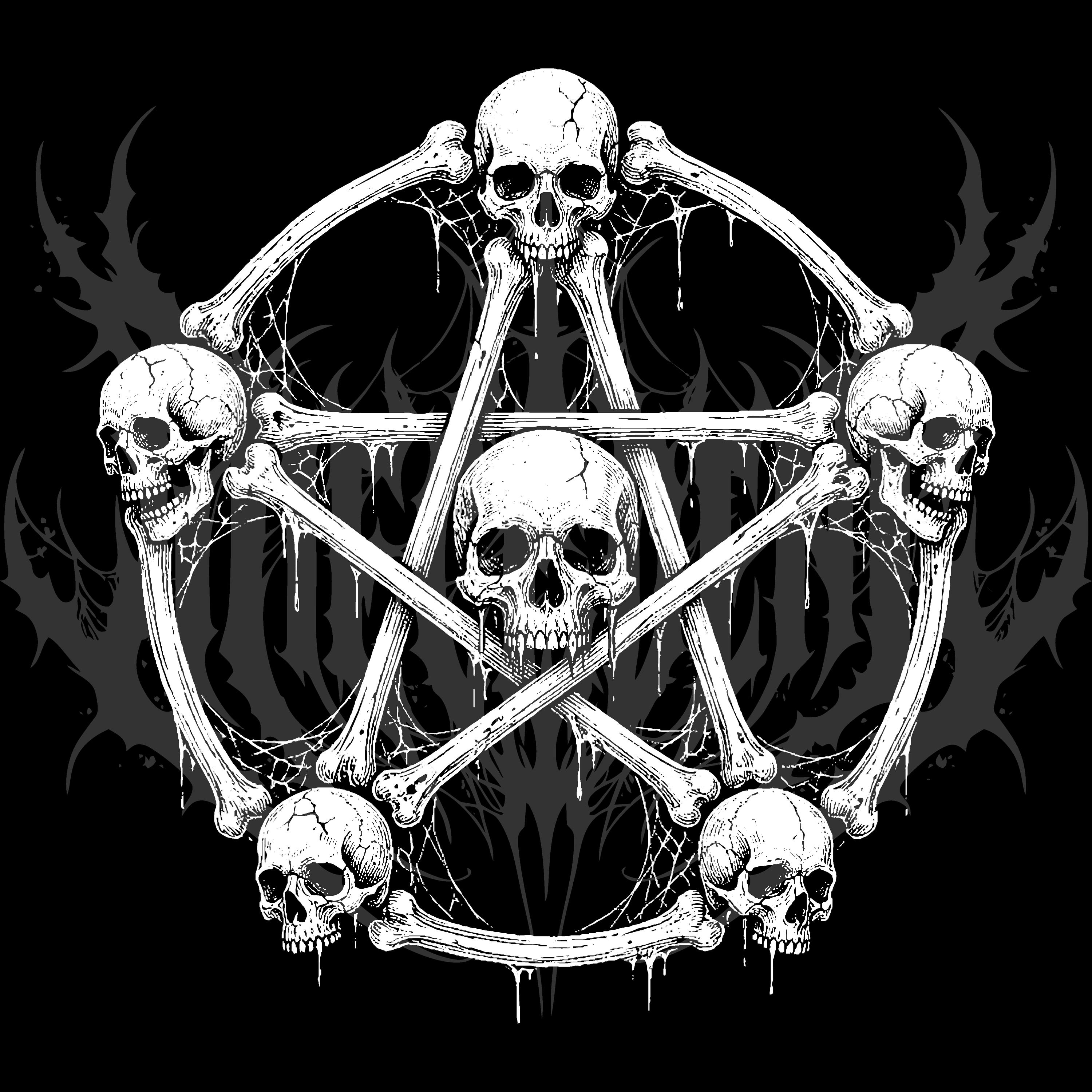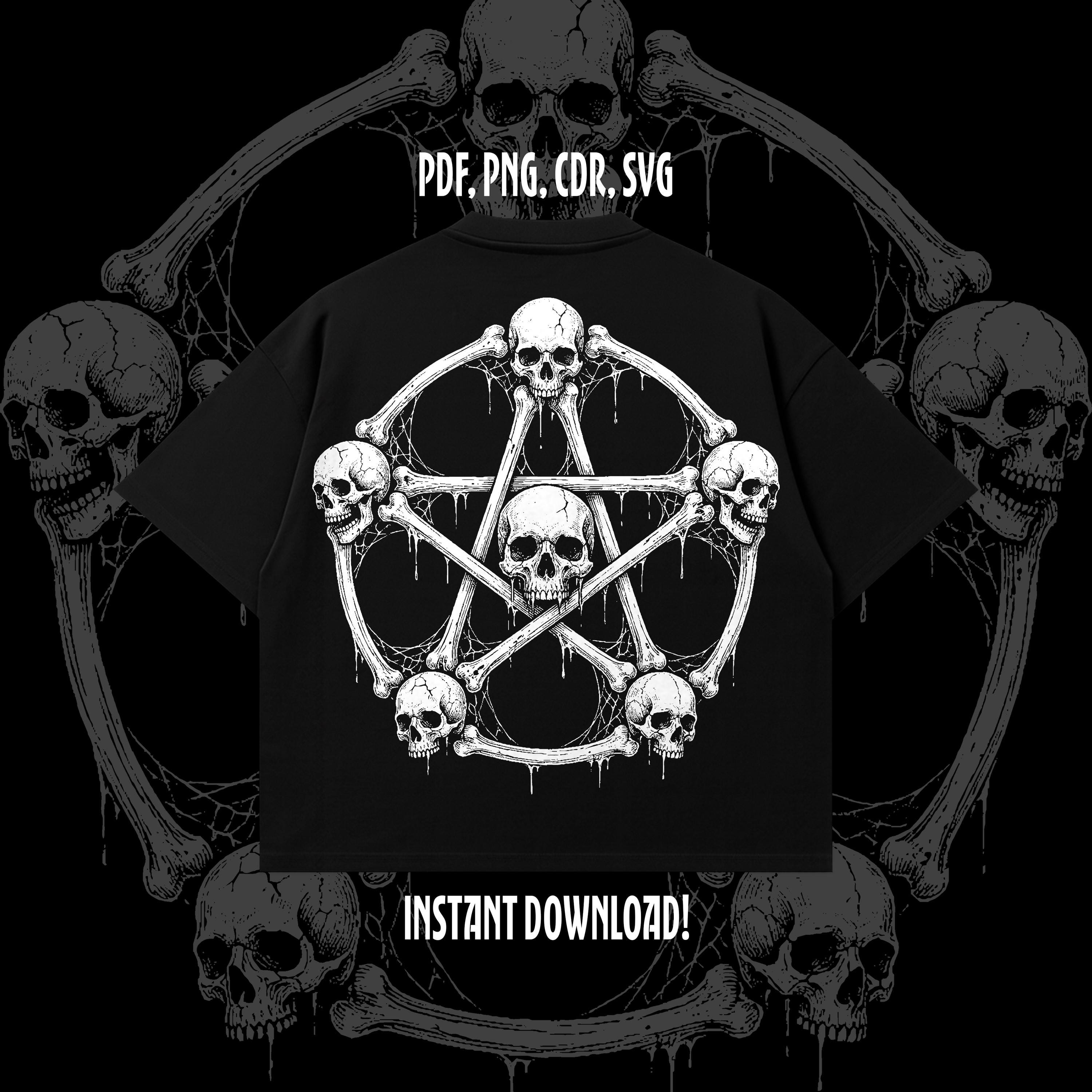 Hyper detailed skull pentagram engraving illustration Pure white on black high contrast aesthetic Occult ritual composition with bone symbolism Vector formats such as PDF SVG CDR or PNG depending on the listing Exceptional clarity even at very large sizes 8K style sharp appearance for professional results Optimized for tattoo printing apparel merchandise and occult horror artwork